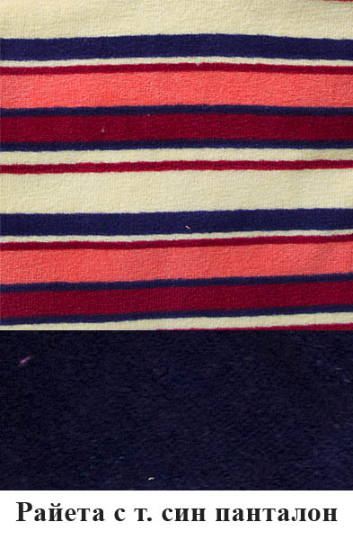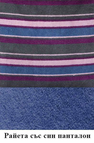 Вариант 1: Тъмни райета със син панталон Вариант 2: Тъмни райета с лила панталон Вариант 3: Светли райета със син панталон Вариант 4: Светли райета с бордо панталон
